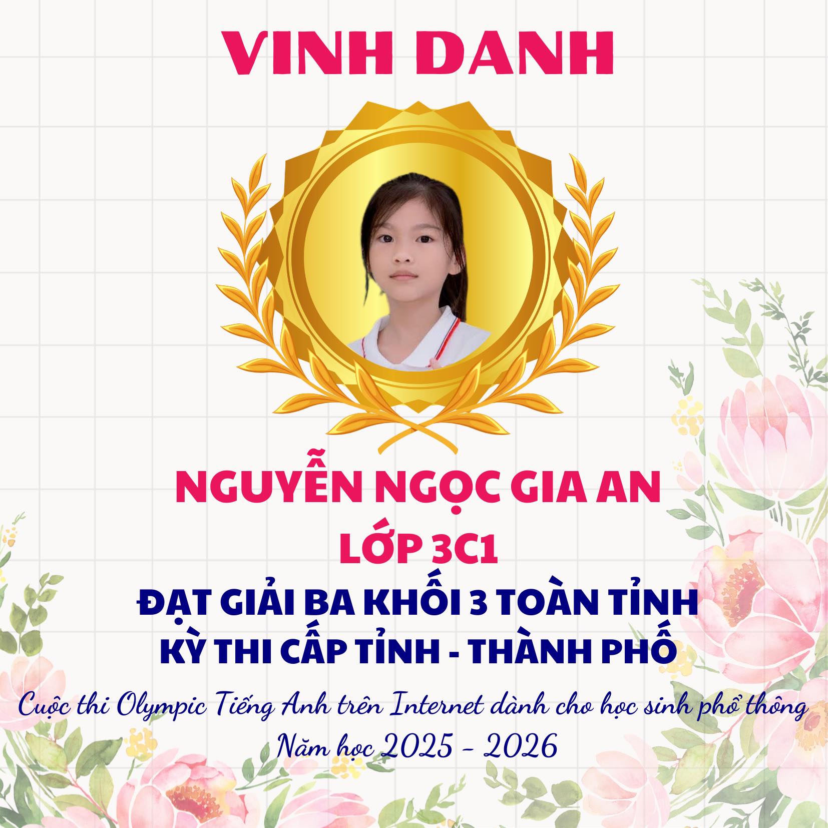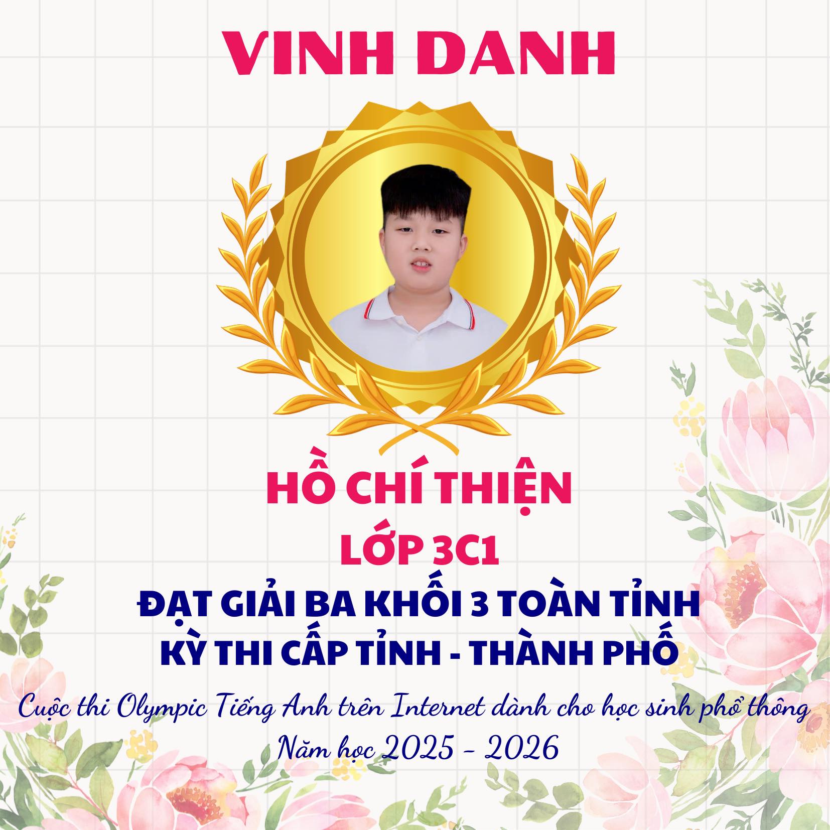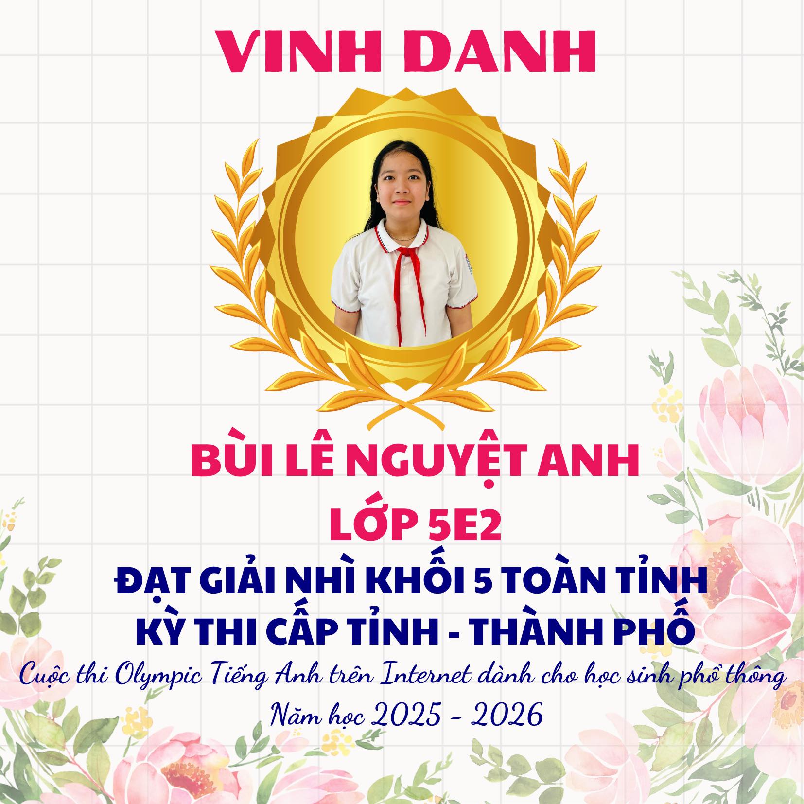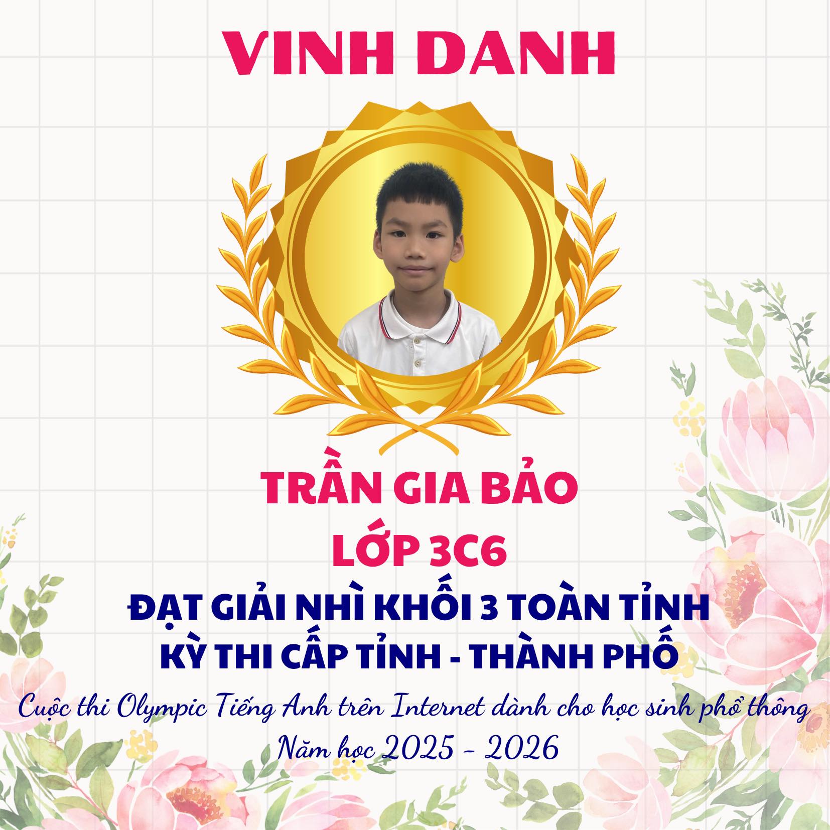 Trong không khí thi đua học tập sôi nổi, trường Tiểu học Lý Tự Trọng vô cùng tự hào vinh danh các em học sinh đã đạt thành tích xuất sắc tại Cuộc thi Olympic Tiếng Anh trên Internet (IOE) cấp Tỉnh, năm học 2025–2026. Đây là kết quả của sự nỗ lực bền bỉ, tinh thần ham học hỏi của các em học sinh cùng sự tận tâm hướng dẫn của thầy cô giáo và sự đồng hành của cha mẹ học sinh.