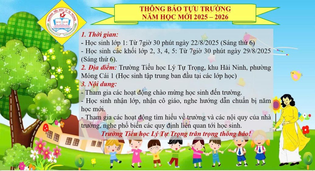 Trường Tiểu học Lý Tự Trọng kính gửi thông báo thời gian tựu trường năm học mới 2025-2026. Trân trọng!